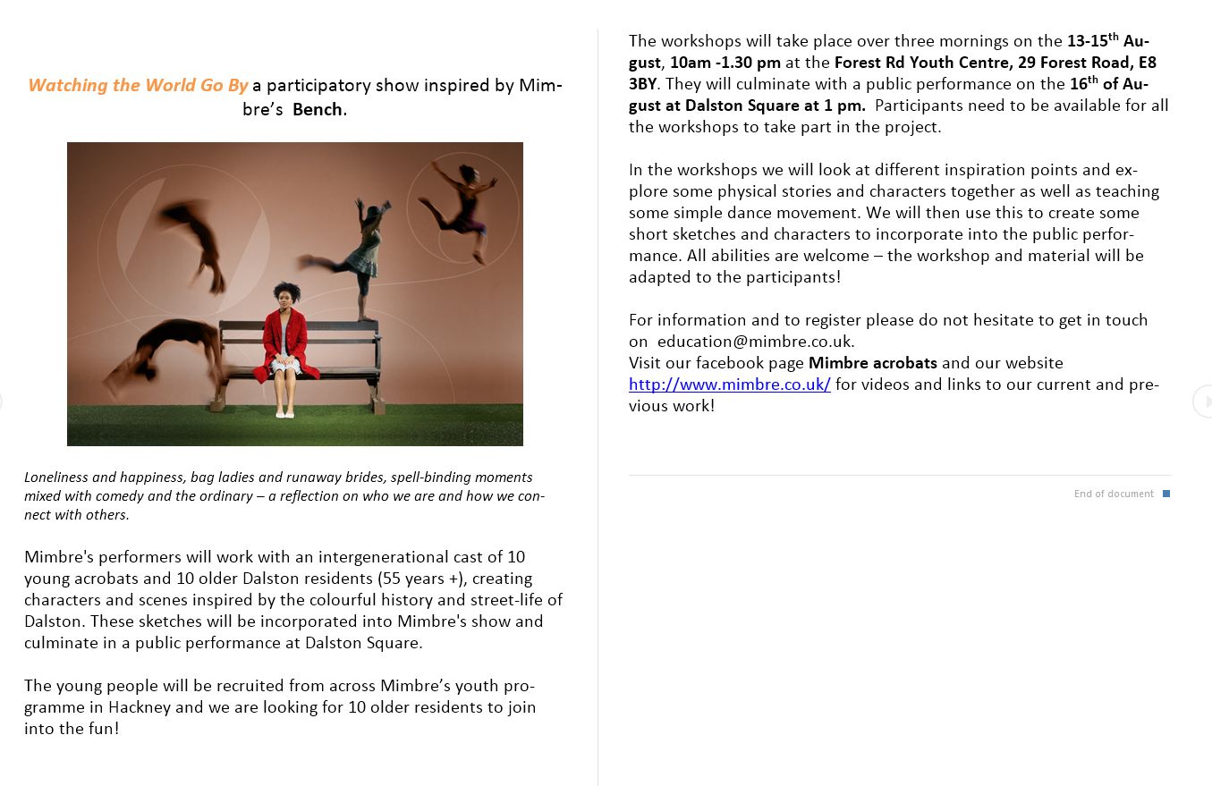 Secondly, are you over 55 and interested in taking part in a street-theatre piece that will be presented here in the Square in a few weeks time? Or do you know someone living locally that may be interested? You would need to be available from the 13th to the 16th August in order to participate (from 10am to 1.30pm the first 3 mornings for rehearsals at Forest Road Youth Centre, with the actual show on the 16th at 1pm here in the Square). Click on the first of the thumbnail pictures below for full details.
