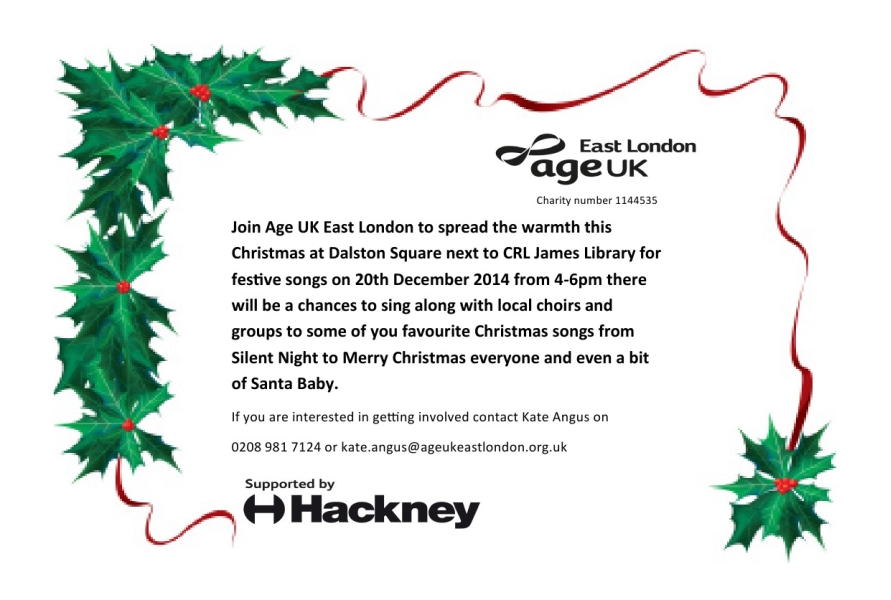 With the current light-box exhibition from Daily Life Ltd. due to finish next week (December 16th), there is just one more event planned for the square this year: Make a note of the date Saturday December 20th, 4.30pm to 6pm. Organised by Age UK East London, there will be carol singing, mince pies, and mulled wine (tea and coffee will also be available). Choirs from across Hackney will be singing festive carols hoping you will sing along. All monies raised through sales of refreshments (and of course the collection buckets that will be present) will go to help Age UK East London continue their as-necessary-as-ever work throughout the region, and spread the Christmas cheer to those less fortunate than us. Please show your support and pop down if you are able to.