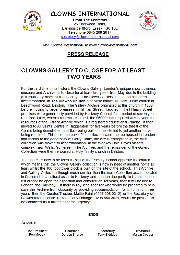 On a completely different note, the Clowns Gallery, London’s unique show business museum and archive, currently housed in Holy Trinity Church (also known as ‘The Clowns Church) in Beechwood Road, is appealing for help. the second thumbnail below is their press release with all the details, so rather than me repeating their words, please click on that thumbnail to view it full size.