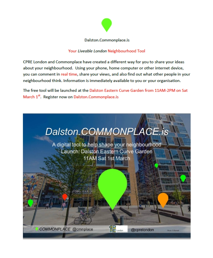 Now news of a new project running in Dalston for the duration of March (and beyond?). Many of you will be aware of services like Yelp that can point you to the right bar, cafe, and/or restaurant when you want it (particularly great as a smart-phone app). How about a research tool that allows you to comment on, not just food and drink establishments but, everything an area has to offer. And the ability to read other peoples opinions of course. Below is the poster that launched the project over the weekend. In their words “… CPRE London and Commonplace have created a different way for you to share your ideas about your neighbourhood. Using your phone, home computer or other internet device, you can comment in real time, share your views, and also find out what other people in your neighbourhood think. Information is immediately available to you or your organisation…. Register now on Dalston.Commonplace.is…” A chance to get your geek on.