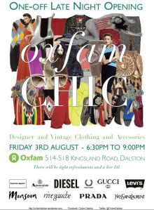 And so to the special event. Over the past several months the guys at the shop have been saving the high-fashion and quality designer and vintage clothing and accessories that have been donated. These will go on sale at a special late night shop opening on Friday 3rd August. Titled ‘Oxfam Chic’, the sale will run from 6.30pm to approx 9.00pm. There will be light refreshments and nibbles available, and Steve, the shop manager, will be donning his DJ hat to supply some cool tunes. There really are going to be some amazing bargains to be had, so get yourselves along there! Click the pic below to see the full-size advertising poster (designed by the Squares own Stephen Humphries – thanks Steve).