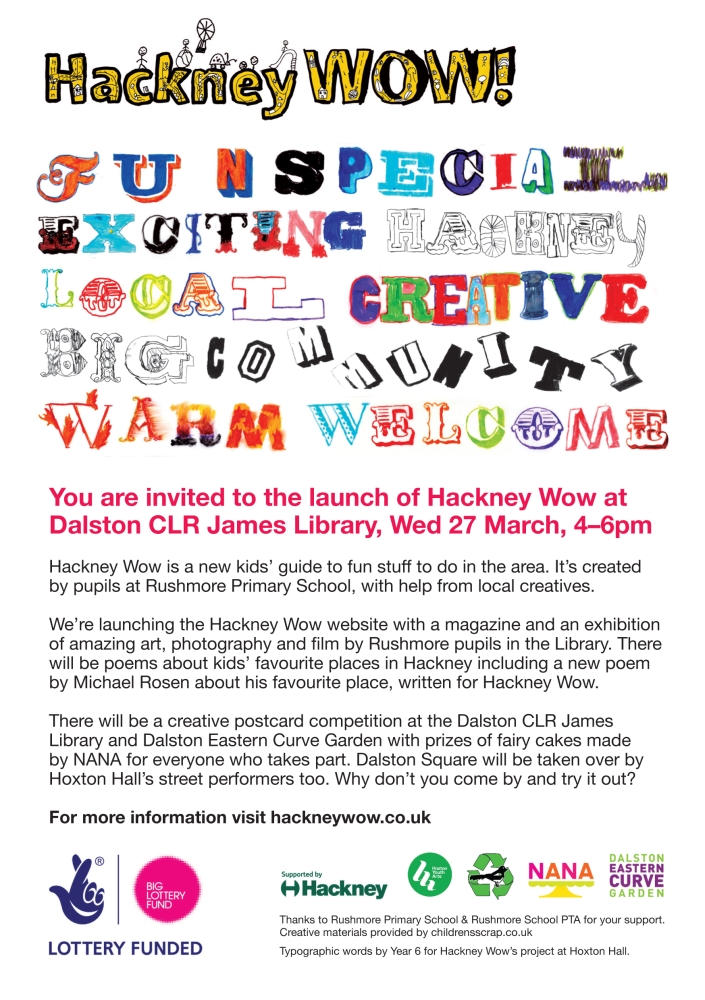 Also from Hackney Council, I have again been contacted by Lucy McMenemy, Cultural Programme Officer, with an invitation to all residents to the next public event to be held here in the C.L.R. James Library, the public space of the Square, and the Eastern Curve Garden. Hackney Wow! is a new kids’ online guide to all the fun stuff they can get up to in the local area, created by pupils at Rushmore Primary School. The planned events, on Wednesday 27th March, are to publicise the launch of this new website. As part of this, Dalston Square will be taken over by Hoxton Hall’s street performers: Cool. For full details of all that is planned see the flyer below (click on the thumbnail to see the full size image), and check out their website at hackneywow.co.uk.