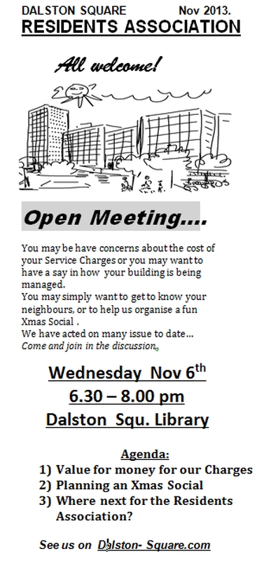 Posters should be going up very soon but in the meantime here are the details of an upcoming meeting of the DSRA which, as usual, is open to any, and every, resident of Dalston Square (owners and renters alike). The location is to be confirmed (though definitely somewhere in the Square), but it will be on Wednesday November 6th at 6.30pm (until around 8pm), chaired by Ben Collins. The agenda is as follows: